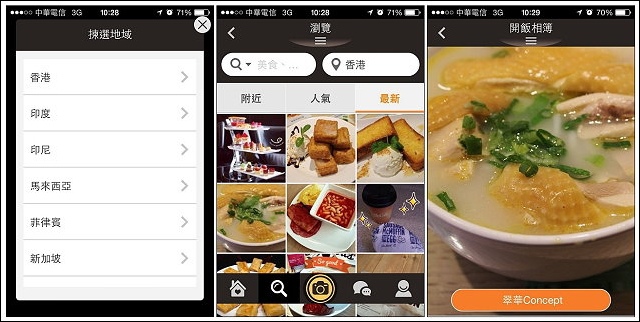 OpenSnap開飯相簿APP的主要功能就是分享美食照片,方便大家「炫food」(Share food),讓使用者直接看照片選餐廳,超級適合我家圖多文字少的記錄風格!目前相簿的資料庫以東南亞國家為主,計有台灣、香港、泰國、菲律賓、印尼、新加坡和馬來西亞,預計末來大陸和印度會上線,超過百萬筆資料,隨意找找香港最近的美食相片,果然出現一堆熟悉的人氣店家。