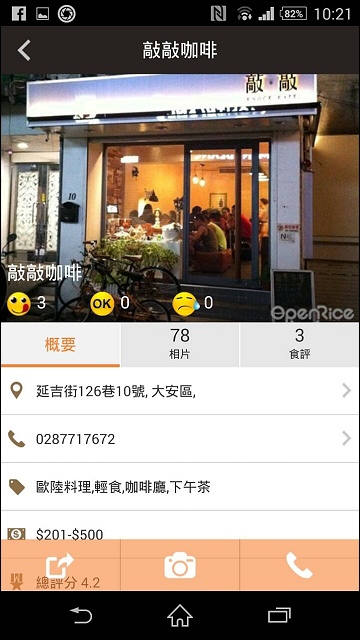 點入有興趣的店家,就會出現店家資訊,地址、電話、平均消費金額,甚至連營業時間都附上了,還有餐廳及菜色相關相片可看,可以參考別人吃了哪些菜,有什麼評語,再決定要去吃什麼。