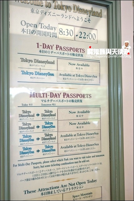 關於門票的部份,東京迪士尼樂園及東京迪士尼海洋的價格相同,兩個樂園皆一票玩到底。可視停留天數來購買,一~四日護照都有,甚至還有夜間護照,分假日三點入園及周間晚上六點,25位以上還可以購買團體護照。不過因為迪士尼園區為維護遊玩品質,當園區人潮擁擠時,將進行入園人數的管制,但購買台灣特別護照及持當日限定日期的票券不在此限(所有票券皆分為指定日期票券與無特定日期票券/有效期限為1年),所謂的台灣特別護照就是在台灣時就跟旅行社購買的門票,使用效期為2014/4/1~2015/2/28,雖然票面上沒有指定日期,但為確保遠道而來的台灣遊客不會被擋在門外,特別開放不在人數管制的範圍內,目前僅台灣和香港有推出特別護照。另外每天營業時間不太一定,記得出發前先查詢清楚。