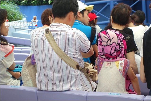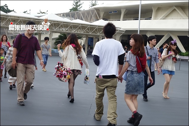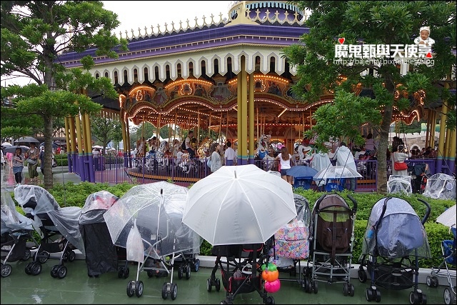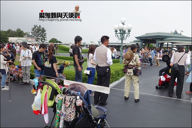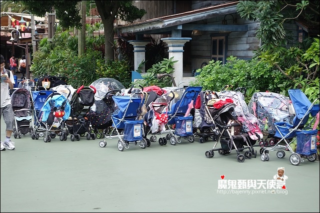 所有設施都規定不能帶推車進去,只能暫放在外面,會有工作人員引導排列的位置。基本上,真的只有在日本,才可以這樣大喇喇地,把戰利品或其他東西隨意擱在推車而不怕被偷走,不過還是會建議帶兩個包入園,一個大包可放些簡單必要如水、雨傘、衣服、簡介等在推車上,小包保管錢包護照等貴重物品,隨時背在身上,不管那個包,重點要輕!因為要揹著走一整天吶。除非你跟某哥一樣是大力士,她的真皮包可是重的跟鐵塊沒什麼兩樣(菸)~~