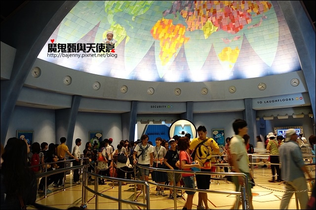 這個遊戲完全重現怪獸電力公司的世界,整個故事背景其實就是個大型躲貓貓遊戲!不怕生可愛的阿布、毛怪蘇利文與大眼仔麥克都有參加,一台車配兩隻手電筒,所以最好坐兩個人就好,沿途都是電影裏出現的場景,過程中就是拿著手電筒到處照,有照到M字裡頭包了顆眼睛的圖案(MONSTERS EYE),躲藏的怪獸或人物的安全帽M就會閃爍,並有所反應,表示被你找到了!過程中座位會360度旋轉移動,是不錯玩,屬於溫和可愛的設施,會令人會心一笑的那種,但完全不刺激喔!不過真正玩的時間才4分鐘,但你卻可能需要排超過一小時的時間,甚至關於園區內平均等待時間有此一說>>要排60分鐘算是幸運、60-90分鐘算是正常、120分鐘也不為過...真的很讓人OX,看網友分享,有時候連拿個FP都要排隊,我的天(有驚嚇到),所以一定要好好規劃作戰方針啊~~
