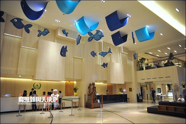 Check in大廳氣派寬敞又帶點夏日海洋氣息,天花板感覺有魚兒在浪花裡熱鬧悠遊。