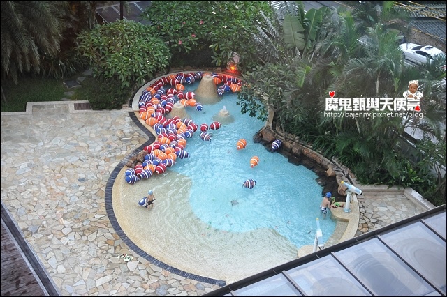 搭電梯進房間時,每個電梯出來都可以看到長榮鳳凰飯店最受歡迎的戶外戲水池和慢活SPA親水空間,暑假期間飯店特地準備了大量Nimo尼莫,讓兒童戲水池變身海底童話世界,果然是親子友善飯店來著。
