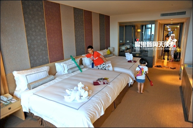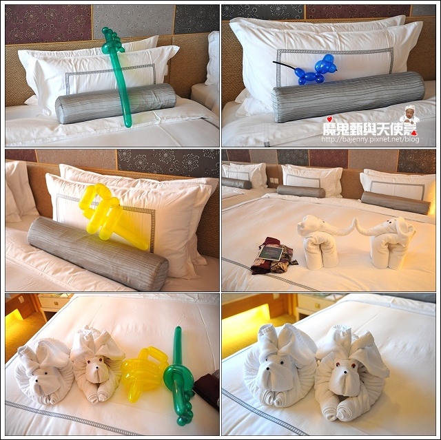 豪華家庭房的空間非常大,一進去兩小就被床上的animal folding towel與造型汽球給吸引,animal folding towel是兩隻狗狗,還分男女,根本捨不得破壞它,太可愛了!
