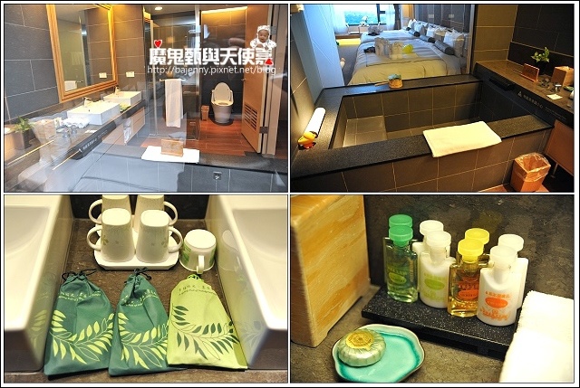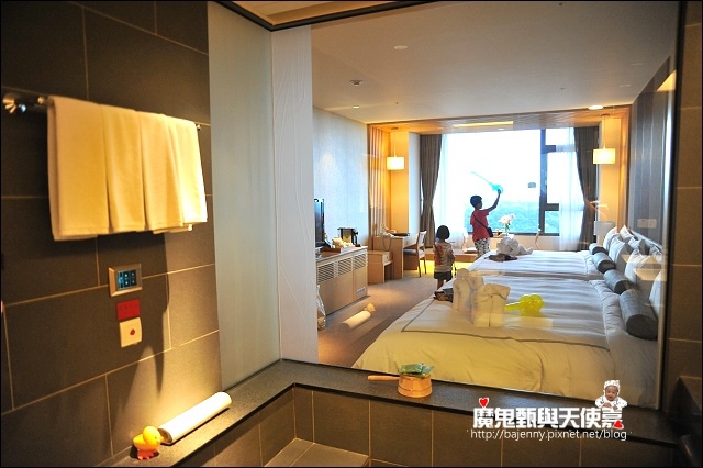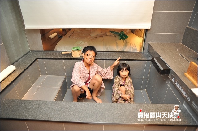 浴室的配置一進去右半部有馬桶、再過去為淋浴間,中間是雙槽洗手檯,左半部是溫泉池。房間與浴室有一片玻璃可透視,想保有隱私時,可以適時放下電動捲簾。裡頭還可以播放音樂聽,特別是浴室空間也不小,妹妹聽著聽著又跳起舞來,後來還加碼要求穿上浴衣,因為她說很像要打拳穿的,然後對著鏡子一直出拳!浴室最大的缺點是沒有可以晾泳衣的地方,這下游泳衣是要怎麼乾啊XD還有少了一個凳子,以妹妹的高度,還要墊腳尖才構得到水檯。