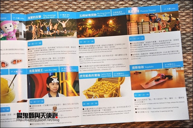 2014/7/1~8/24的夏日狂想曲專案,房客可以免費參與的活動很多,7:00~8:00遊秘境、9:00~10:00黑章魚的詛咒(橡皮筋槍)、9:30~10:30航海鍛造師(海賊船diy)、11:00~12:00魔法黑鬍子(造型氣球)、15:00~15:30觀慶時光(跟可愛人偶合照)、14:30~16:00扭轉奇冰(冰砂diy)、16:30~17:00海軍的反擊(水中遊戲競賽)、16:30~17:30我是海賊王(海盜頭巾diy)、19:30~21:00五峰秘境探險、20:00~20:30虎克船長的寶箱、21:15~21:50鳳凰劇場(小丑雜技表演)、22:00~23:00提斯瑜珈,假日還加碼手作餅乾小教室,幾乎是從checkin開始一直到隔天退房都有活動可參加,有興趣的朋友記得早點check in,早點預約報名。