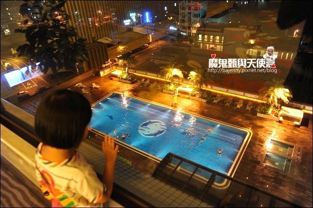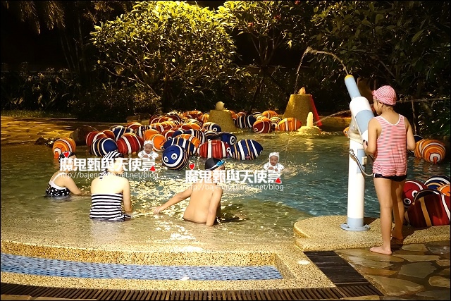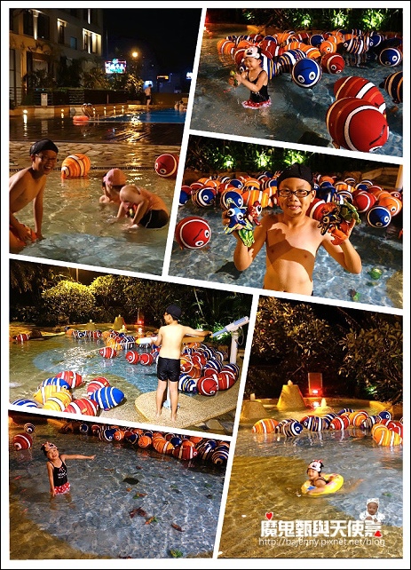 其實妹妹一到飯店,看到戲水池裡一堆尼莫就瘋了,若不是阿母怕曬,晚飯前就被拉下水了...不過這種天氣,還是傍晚以後最適合玩水啦!既不會太熱也不用怕曬,玩水最要注意安全,我們一人顧一隻。妹妹很有使命感,一直說要救魚,只要魚兒們不小心游到火山區(其實只是小小的噴水池),她就說要去救他們出來,害我也跟著被困在這區很久很久XD