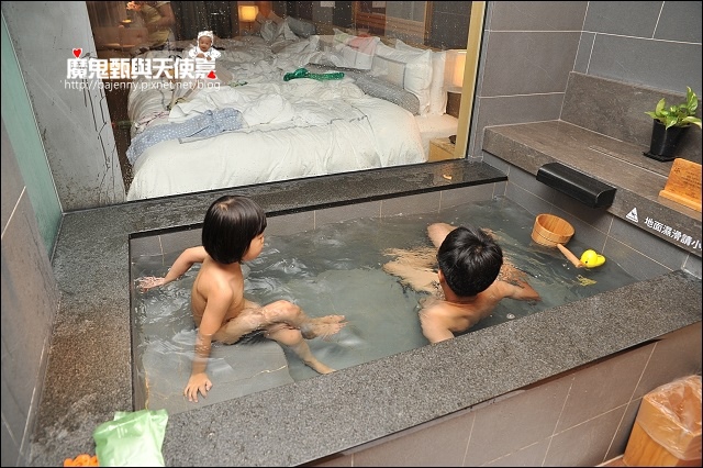 溫泉池可以泡一大兩小沒問題,兩個大人都進去會有點擠...蓮蓬頭的水量很剛好,溫泉池水很快就滿、放水也快,超神速!