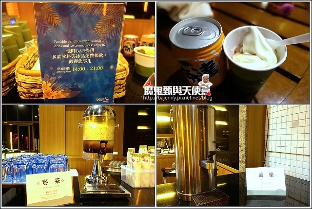 吃完晚餐休息一下,終於來到5樓的慢活spa和戶外游泳池時間,置物櫃內備有大浴巾,小孩的大浴巾可以直接披去游泳池(這點很貼心),另池畔提供簡易易開罐飲料,還有自助式麥茶、薑茶,冰淇淋有原味、巧克力及綜合可以選。