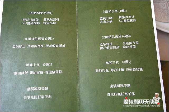 我們的是四人精選特餐(2,888元),有蘭陽風味盤(6選3)、蒜香當紅炸子雞兩吃、主廚私房菜(4選1)、宜蘭特色蔬菜(3選1)、風味主食(3選1)、礁溪鳳凰美點及養生桂圓紅棗芋泥。