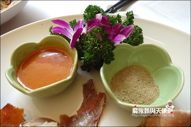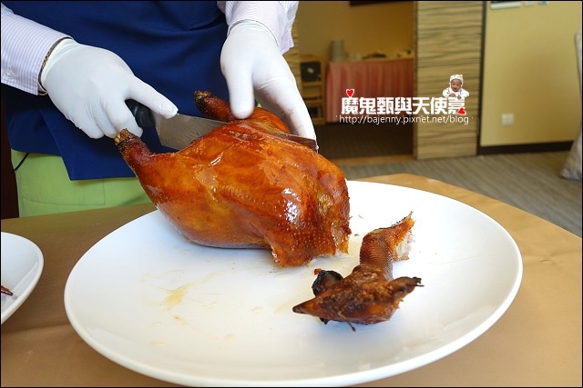 當天的重頭戲:蒜香當紅炸子雞二吃,第一吃是片蒜味雞,推出來桌邊服務。