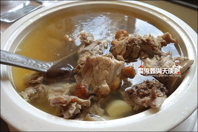 第二吃是蒜頭香菇雞湯,這湯非常好喝,我家阿妹連喝兩碗不打緊,最後好像有喝到第三碗,原本我跟允嘉都被雞肉給餵飽了,看到妹妹喝成這樣,也忍不住各來一碗,果然好喝!