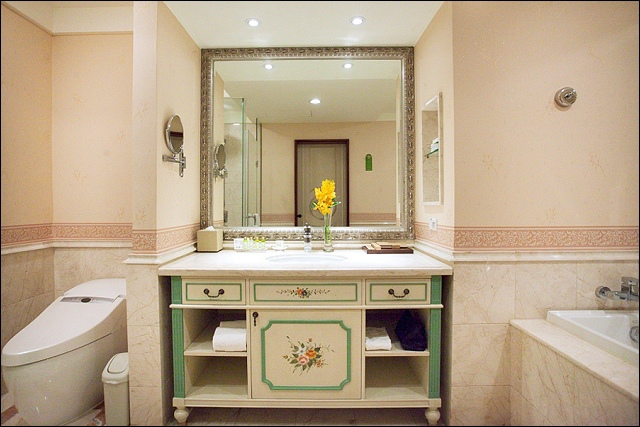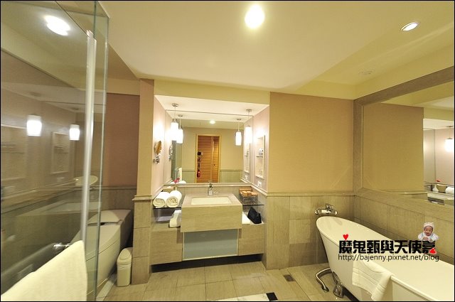 乾濕分離的浴室空間大,還有大浴缸,水量大又穩定,可惜沒附泡澡精油或浴鹽。