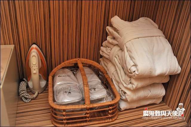 浴袍質料一般,拖鞋算厚,為商務客人準備的熨斗。