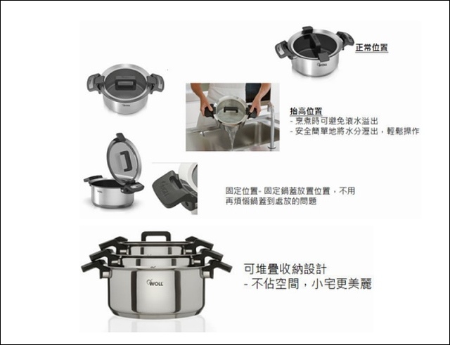 第三種可固定鍋蓋,直接架在上面,不必再煩惱鍋蓋放那裡的問題,這個功能太實用了!另外WOLL的鍋身為304(18/8)不銹鋼製成,符合歐洲食品容器高規格標準EN12983,摸起來非常厚實,也相當具質感。