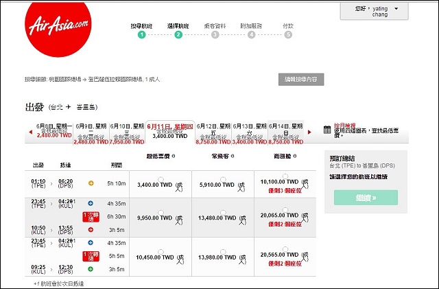 亞航台北直飛峇里島固定每週一丶二丶四丶六,一週四班,航班時間為: