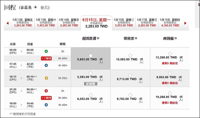 峇里島飛台北:傍晚18:00~凌晨00:01(+1天)