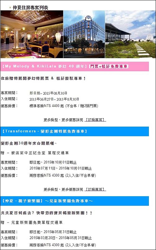歐華酒店推出暑期國人住房專案,My Melody & KikiLala夢幻40週年,凡是此專案訂房者,免費載您到松菸欣賞My Melody三麗鷗夢幻特展,四人房每人只要$1425元起,另外還有中正紀念堂變形金剛特展和兒童新樂園的免費專車喔!