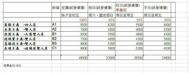 基本上,梅花湖悠悅光試營運房價屬中價位,我們住的四人房平日4,800、旺日5,500、假日6,200元,加人加床1,500,不加床1,000,小朋友為500元,雙人房中我自己最喜歡二樓的天窗雙人房,有機會應該不帶小孩來二度蜜月,好好浪漫一下~~六個房間寒暑假旺日包棟總金額是28,500,假日是32,000,九月以後平日是24,900,附加價值一堆,可以歡唱、打麻將、玩水、開伙或烤肉,且因為民宿主人有自己的公司在運作,如果要報銷員工旅遊的費用,需要開發票的朋友,民宿都可以配合喔。另外這裡爆料一則小道消息,聽說趙又廷這禮拜會去民宿拍攝佳麗寶廣告XD