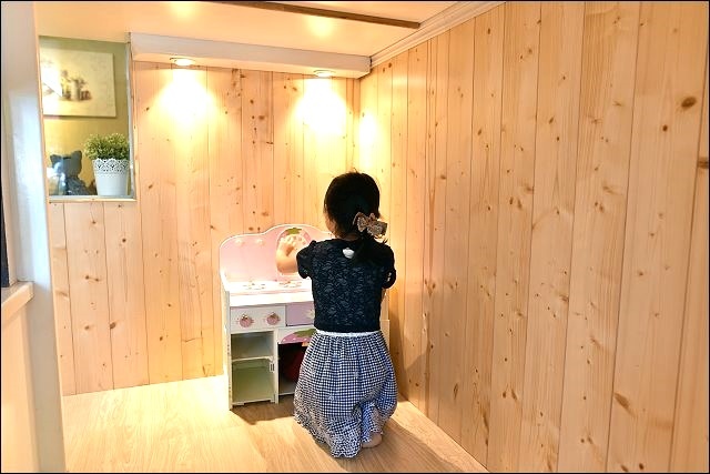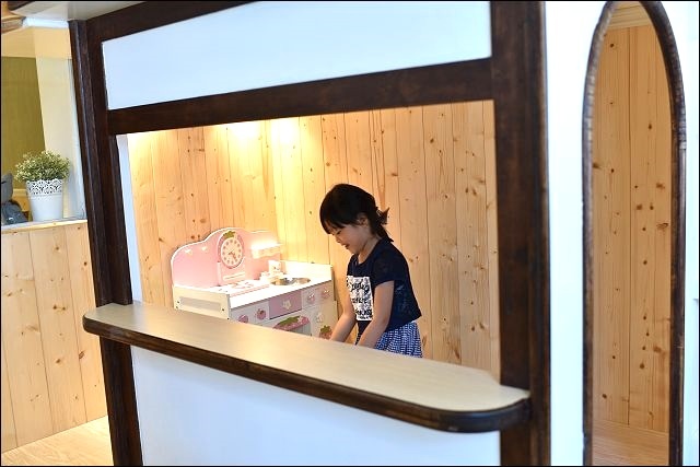 溜滑梯下面有吧台和辦家家酒,廚房辦家家酒的門好像已經損壞,也沒看到小道具可以玩。