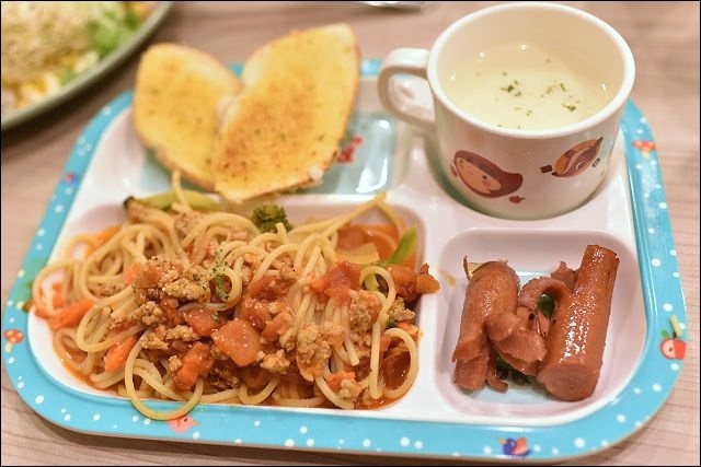 限6歲以下的兒童餐,有肉醬麵、香蒜麵包、濃湯和章魚香腸,蕃茄醬是店家自行熬煮,裡面還有紅蘿蔔。