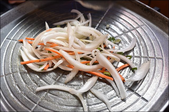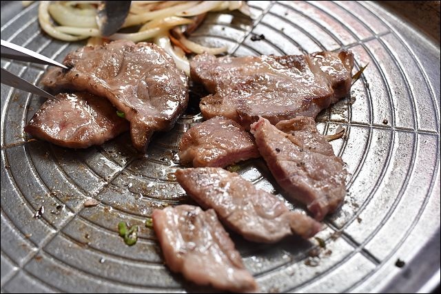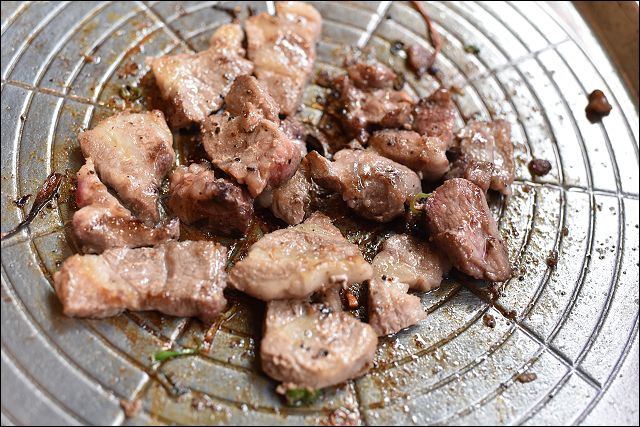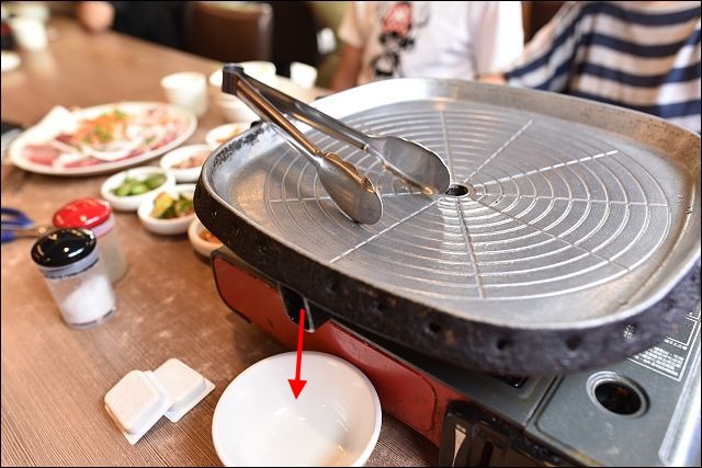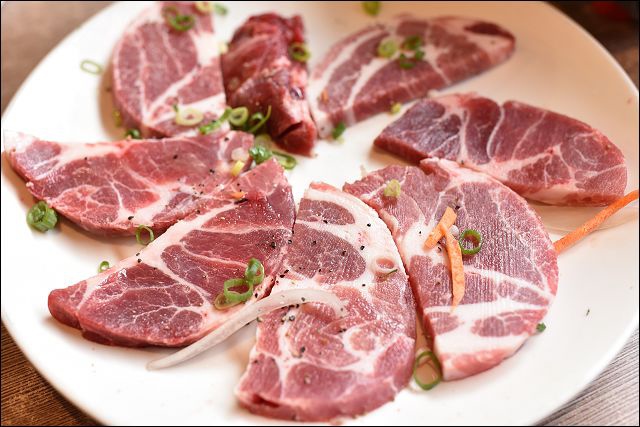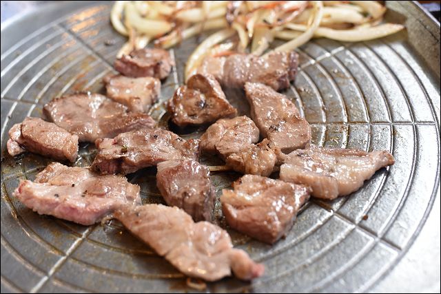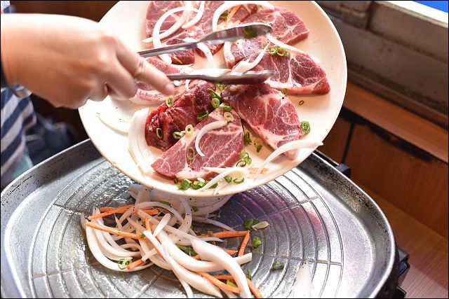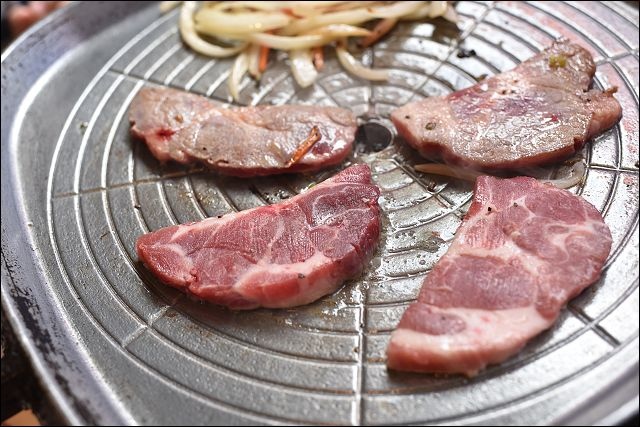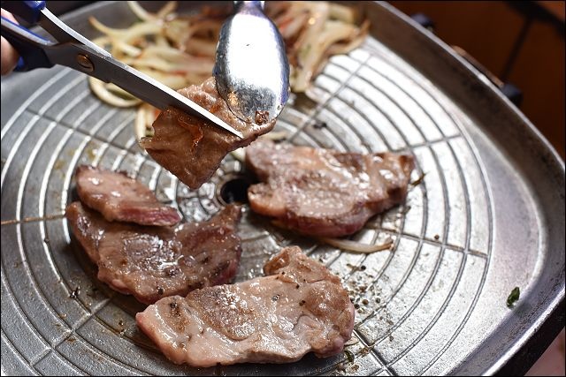 韓鮮味有銅盤烤肉和鐵板烤肉,我們選價位較高會滴油的鐵盤烤肉~烤梅花豬肉300元(新莊店)。