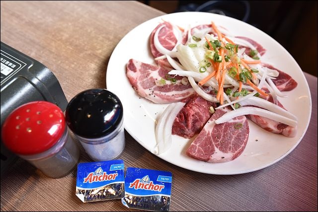 梅花豬肉很有厚度,先將安佳奶油和洋蔥爆香,豬肉在鐵盤上烤一烤剪一剪,再簡單加鹽和胡椒提味就很好吃!