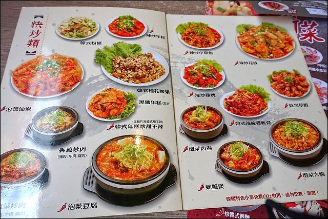 韓鮮味的招牌就是韓國特色小菜免費自行取用,但每人有最低消費170元(另加收10%清潔費),單點菜單有銅盤烤肉、鐵盤烤肉、經濟套餐、煎餅、鍋類、湯類、乾麵類、湯麵類、涼拌、快炒和特調飲料。