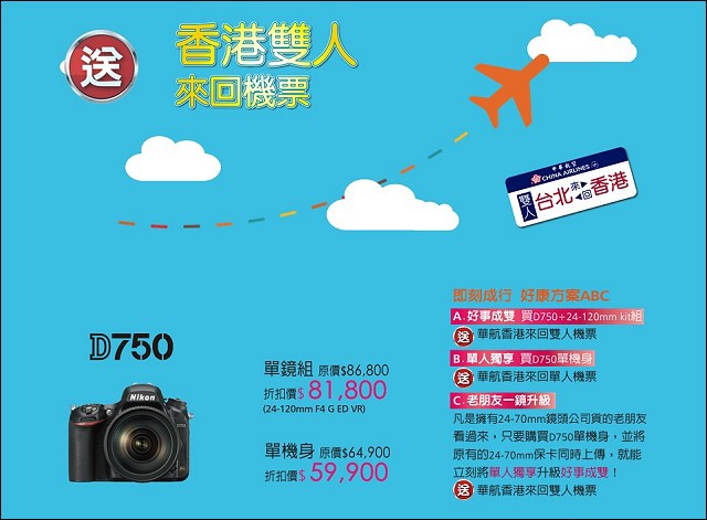 剛剛又得到最新消息!8/1~8/31除了降價5千元之外,現在買Nikon D750單機身,還加送華航香港來回單人機票,D750+24-120mm kit組就送華航香港來回雙人機票!
