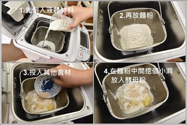 先放液體食材,倒入180L鮮奶,再依續放入高筋麵粉、砂糖、塩、無塩奶油,最後在中間挖個小洞,倒入酵母粉,避免提早發酵。建議大家把材料都放到麵包容器中之後,再把整個麵包容器放到機器本體裡,這樣才不會發生液體倒到機體中導致損毀哦!