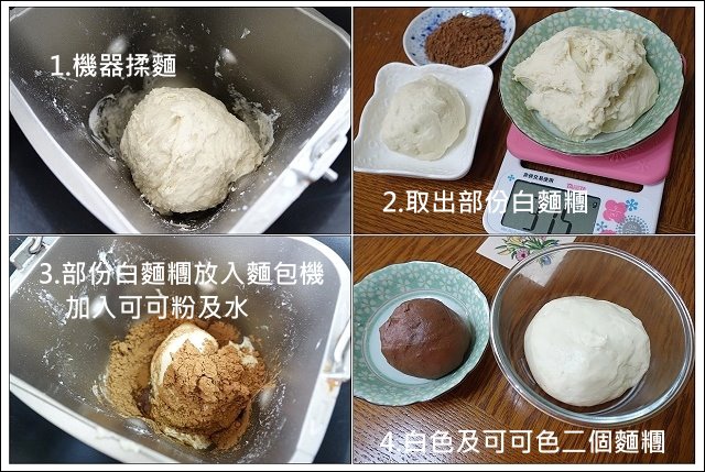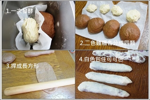 手工作業的蜂鳴聲響起後,發酵完成,取出可可麵團及白麵團,開始整形,分割並滾圓(圓形有利發酵),一大三小(白麵糰做成50克一顆40克三顆,共四顆可可麵糰粉分成100克一顆,八十克三顆,共四顆(如圖2.),這裡可以蓋溼布或蓋錫箔紙醒麵,接著第3步則是將小麵糰分別捍成長方形,再捲成長條,捲的時候可以紮實一點,避免空氣留在裡面,最後再以白麵團包住可可麵團收口,包覆口一定要黏緊。