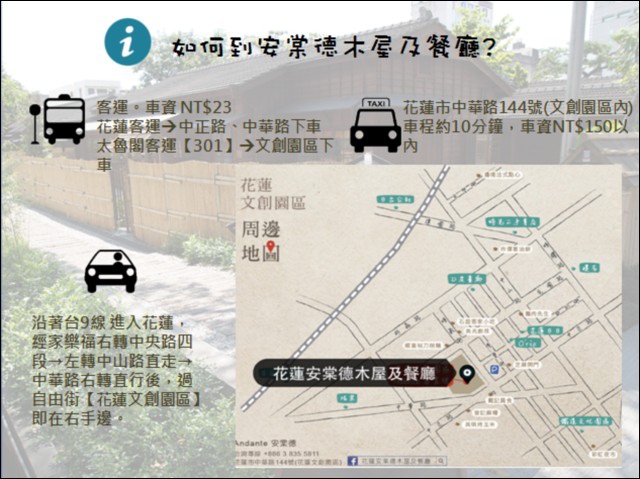 要找安棠德小木屋及餐廳,GPS設定在花蓮文化創意產業園區就會到,check in櫃台就在花蓮文創園區入口正後方,遊客服務中心對面的安棠德餐廳。