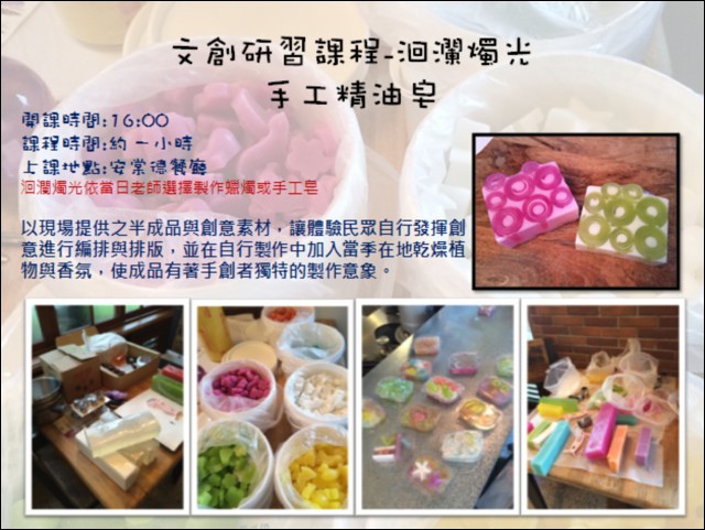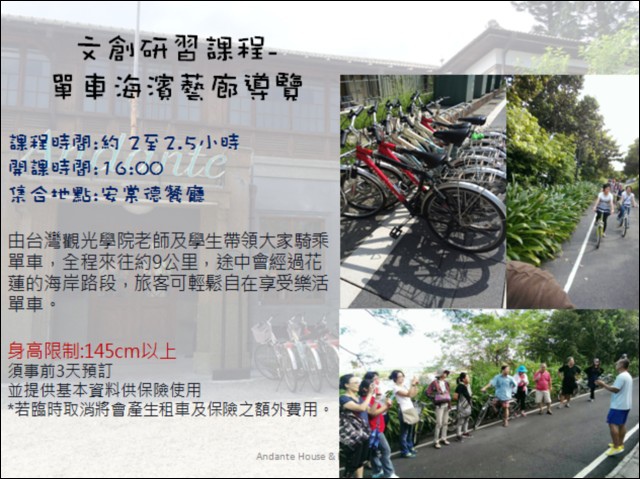 每天早上和下午四點在Andante House安棠德餐廳都有文創研習課程,有付費的人每人可選一項體驗,不過最困難、有深度的單車海濱藝廊導覽妹妹不能參加,好里佳在,全程9公里要騎2~2.5小時耶,我們這群老弱婦孺還是挑輕鬆點的做就好XD