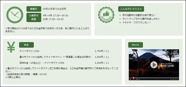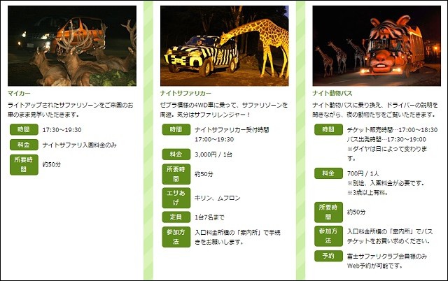 另外晚上也可以入園喔,入園費跟乘車費用都會比較便宜,雖然可以待的時間相對短,另外付費的選項有導覽人員隨行解說(但必須聽得懂日文才有用),於六點半出團,這個有點結合叢林巴士跟散策步行的course,耗時2小時,必須事先網路預約,料金是2,000円,還有一個是晚上八點的特別巴士之旅,可手持夜視鏡觀察動物在黑暗中的活動,之前有去過新加坡的夜間動物園,感覺粉不錯!(※資料照片皆取自官網※)