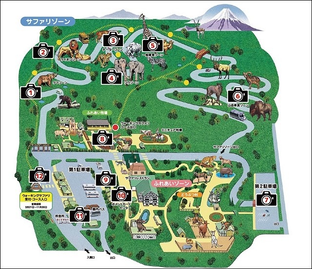 整個野生動物園區最精彩的地方就在①~⑥這一整片,需要開車進入的區域,①~③是猛獸區④是大象⑤是一般草食區⑥山岳草食區。遊園方式分成三種,第一種是最多人搭的叢林巴士,共有十種造型,一般就是按照來的時間買票,平日每30分鐘一班車,假日10分鐘一班,如果是富士的會員可以網路先預約。(※資料照片皆取自官網※)