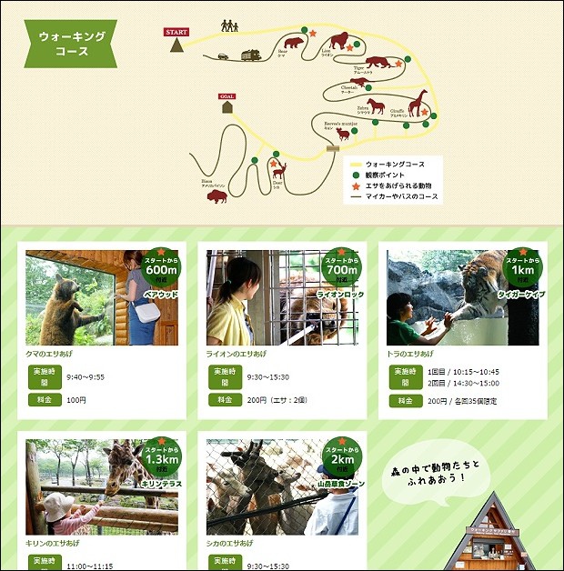 除此之外,不想坐車也可以用走的,這裡規劃了一條散策步行的路線,約2.5公里長,路程需90~120分鐘,必須四歲以上才能參加,途中設有不同的觀望台可以看到動物的棲息地,同樣可以付費餵食。另外值得一提的是,因為是親子同遊的熱門景點,這裡的廁所都設計的比較矮,方便小小朋友上廁所。(※資料照片皆取自官網※)