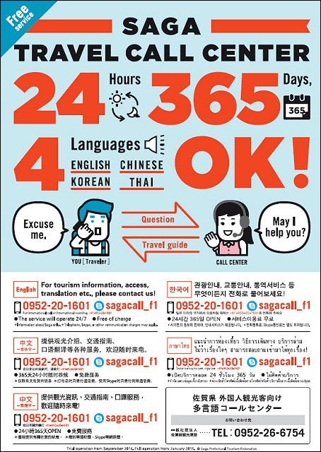 也可以透過佐賀的多國語言CALL CENTER,一年365天24小時線上都有人服務,目前提供中文/英文/韓文/泰文等4種語言的服務。
