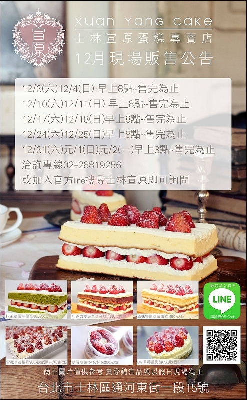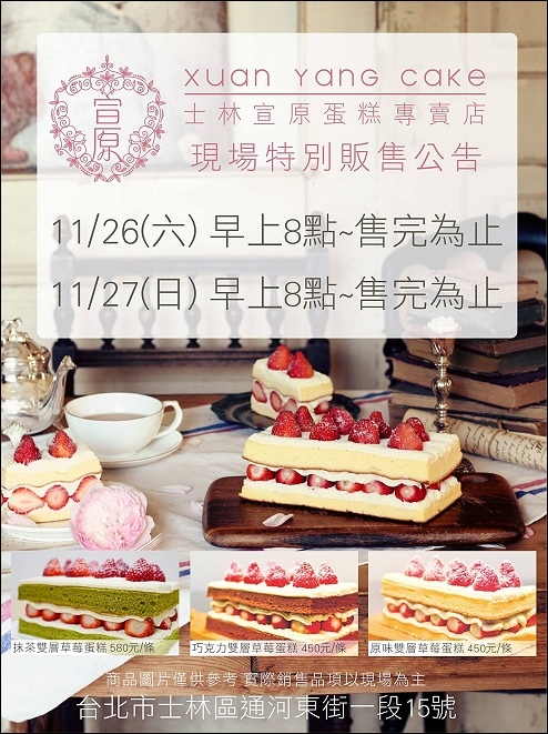2016/11/26更新→ 士林宣原蛋糕專賣店今天正式開賣,也間接宣告了年底草莓季的來臨啦!原本士林宣原草莓蛋糕的FB粉絲專頁,宣告今年要12月才有現場販售蛋糕,預計12/3下周六假日開賣,結果剛才逛PTT FOOD版時,發現今天已經有網友去現場排隊入手草莓蛋糕啦!點去宣原蛋糕FB粉絲團看,才發現這禮拜六日提早有限定售販公告,也就是說今天和明天早上就會有一堆人去河堤邊排排隊啦~~
