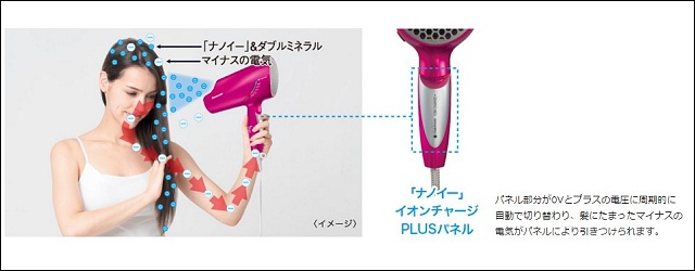 奈米水離子吹風機EH-NA45,強調有白金負離子。