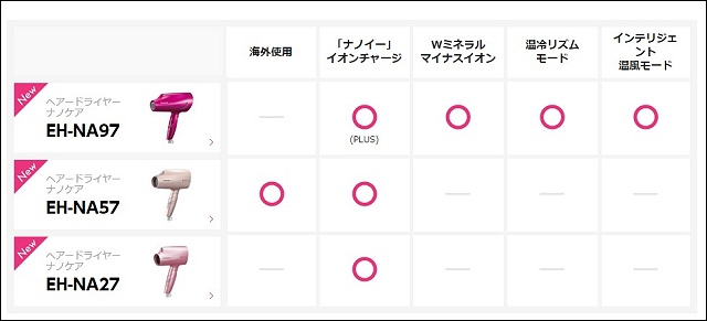 EH-NA45、EH-NA27與EH-NA30皆為奈米水離子吹風機系列的機種,NA45多了白金負離子!NA27為10月新推出與日本同步的機種,主打輕巧機型,目前於網路通路及百貨販售。而NA27與NA30在風量跟風溫的控制鍵設計有些微不同,雖然都是冷暖熱三段溫度及兩段式風量,但NA27為單鍵控制,NA30則是有風量及風溫兩種控制鍵,組合稍微多一些。