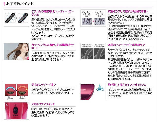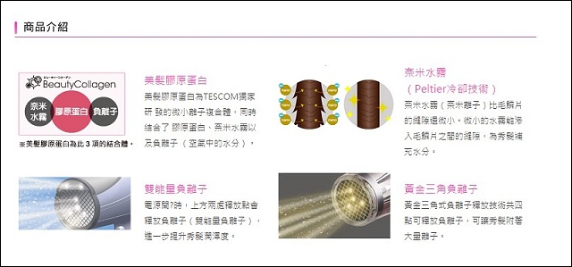 特點是有膠原蛋白、負離子和奈米水霧三合一,這種東西我們先不去研究,只管吹起來舒不舒服、快不快乾和毛不毛燥。