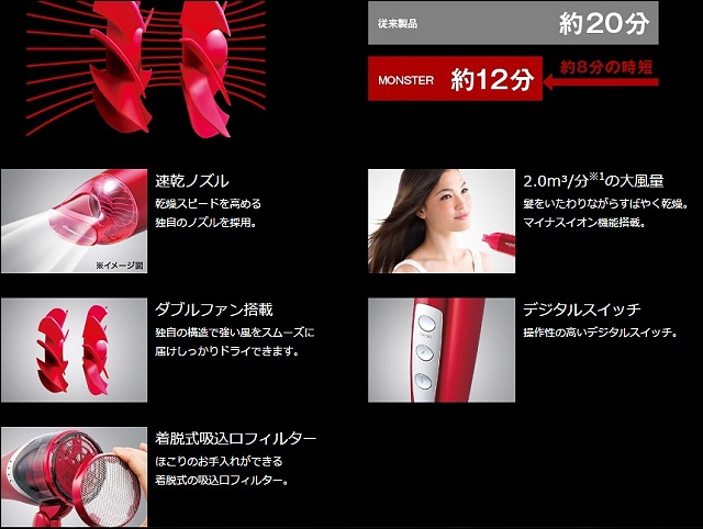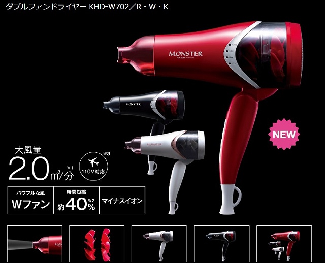 KOIZUMI MONSTER KCD-W701雙渦輪設計,透過兩組風扇每分鐘可送出2.0立方公尺的超大風量,架上有銀灰跟大紅,我選了大紅色,這台現在降價6,980日圓(台幣約1885元)(台灣y拍代購價約2200元),在BIC CAMERA得到的答案是停產,沒想到唐吉軻德有。不過另一台K COSMETIST(KCD-12BK)可以直立收納的負離子大風量吹風機,這裡沒有,反而在BIC CAMERA買到,未稅3,980,含稅4,298日圆。