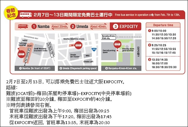 春節期間(2016.2/7~13)另提供免費巴士接送客人,將在難波站、梅田站及EXPOCITY往返接送,幾乎一個小時就有一班,一直到下午五點多,回程從EXPOCITY發車最晚時間是晚上八點半,屆時門口會設置集中保管行李箱的地方,大家可以多加利用。
