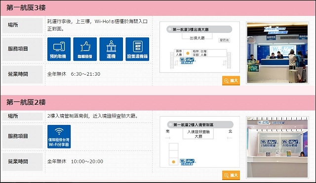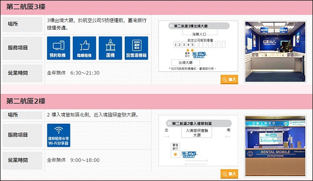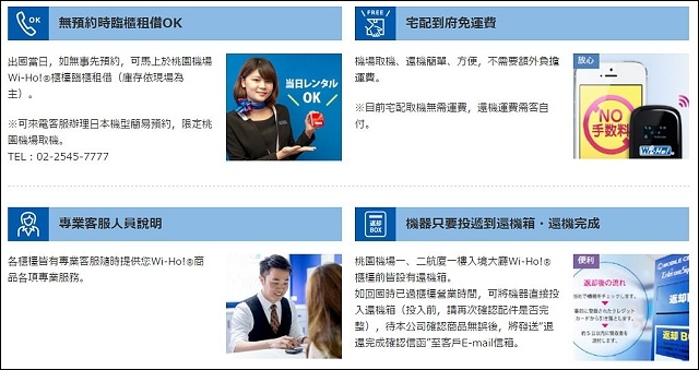 先不管租借的機種、價位和方案,Wi-Ho!特樂通相較於其他日本Wi-Fi分享器最大的優勢,就是在台北松山機場、桃園機場和高雄小港機總共設有8個服務櫃台,提供租借、領機和歸還的服務,雖然是全年無休,但在機場領機僅限時上班時間(不同機場時間請參考這裡),而歸還可以直接投遞到還機箱,桃園機場24小時都可以歸還,松山機場是交還中華電信櫃台人員(07:00~23:00)。