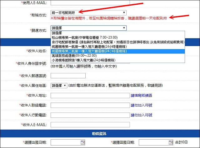 為了保險起見,避兔在機場拿不到WIFI分享器,我們選擇取機方式為機器前一天宅配到府,反正宅配到府免運費;還機時則選擇機場入境大廳,直接放在24小時還機箱即可,不用把機器帶回家,也省了還機時的宅配費。