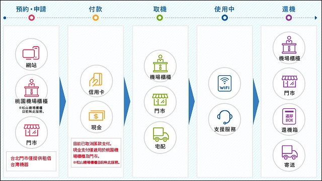 租借方式很簡單,網路或電話預約申請→信用卡或現金付款→機場櫃檯/門市/或前一天宅配到府,使用信用卡付款免押金,無預約櫃台臨時租借也ok。