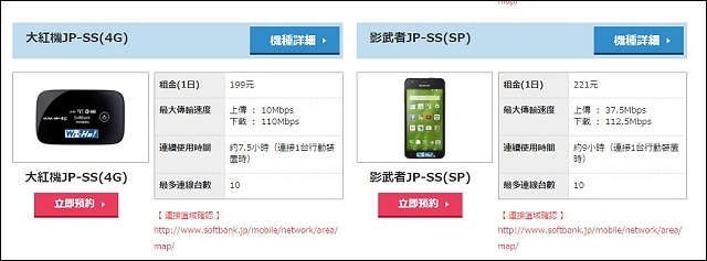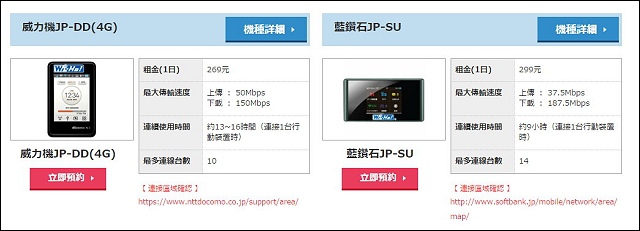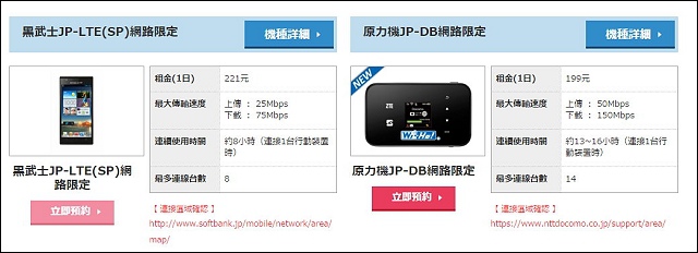 針對日本的上網機有日本3大電信的6款機種,全部都對應4G-LTE,也可以加價購買行動電源和安心保險。流量大的重度使用者,請選藍鑽石;在意收訊範圍會到日本偏遠地區推威力機;價格考量可選最便宜的大紅機和原力機(這兩台屬於MVNO二類電信業者);商業人士則推薦黑武士和影武者,這二台就是智慧型手機(英/日文)。
