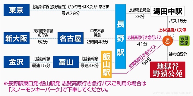 電車轉巴士或計程車:JR長野駅→長野電鐵特急→(車程四十分鐘)→湯田中駅→計程車(車程5分鐘)/巴士(車程15分鐘)