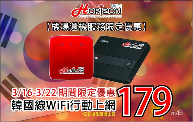 上一波的日本線優惠價之後,現在3/16~3/22的七日限定優惠輪到韓國線,韓國線WiFi上網 無法指定機種一天只要NT$179元,可以省不少錢喔!只要從廠商提供的魔鬼甄與天使嘉粉絲專屬連結來下單(→ https://goo.gl/JxD2wG),無論選哪一個韓國WiFi商品,價格都會自動便成為優惠價NT$179元,WiFi上網 無法指定機種隨機安排機器出貨,基本上韓國都是大容量,沒有流量限制,但短時間大量傳輸還是會被停止的喔(例如一小時內就傳輸了10GB等等),想使用此方案,務必請大家歸還商品要在桃園機場入境大廳多加利用歸還~