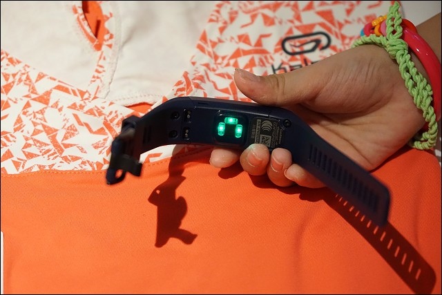 vivosmart HR背後三個亮晶晶的光點,就是把光學心跳偵測的功能放進去,這也是這一代產品的最新賣點-- 增加了光學心跳的功能,之前戴vivosmart的時候,要偵測心跳,還要另外綁一條心跳帶在胸口上,對一個要帶小孩的阿母或是Lady來說,綁起來多麼的不舒服~~有了光學心跳的功能以後,只要一個手環就可以搞定量心跳的麻煩事。